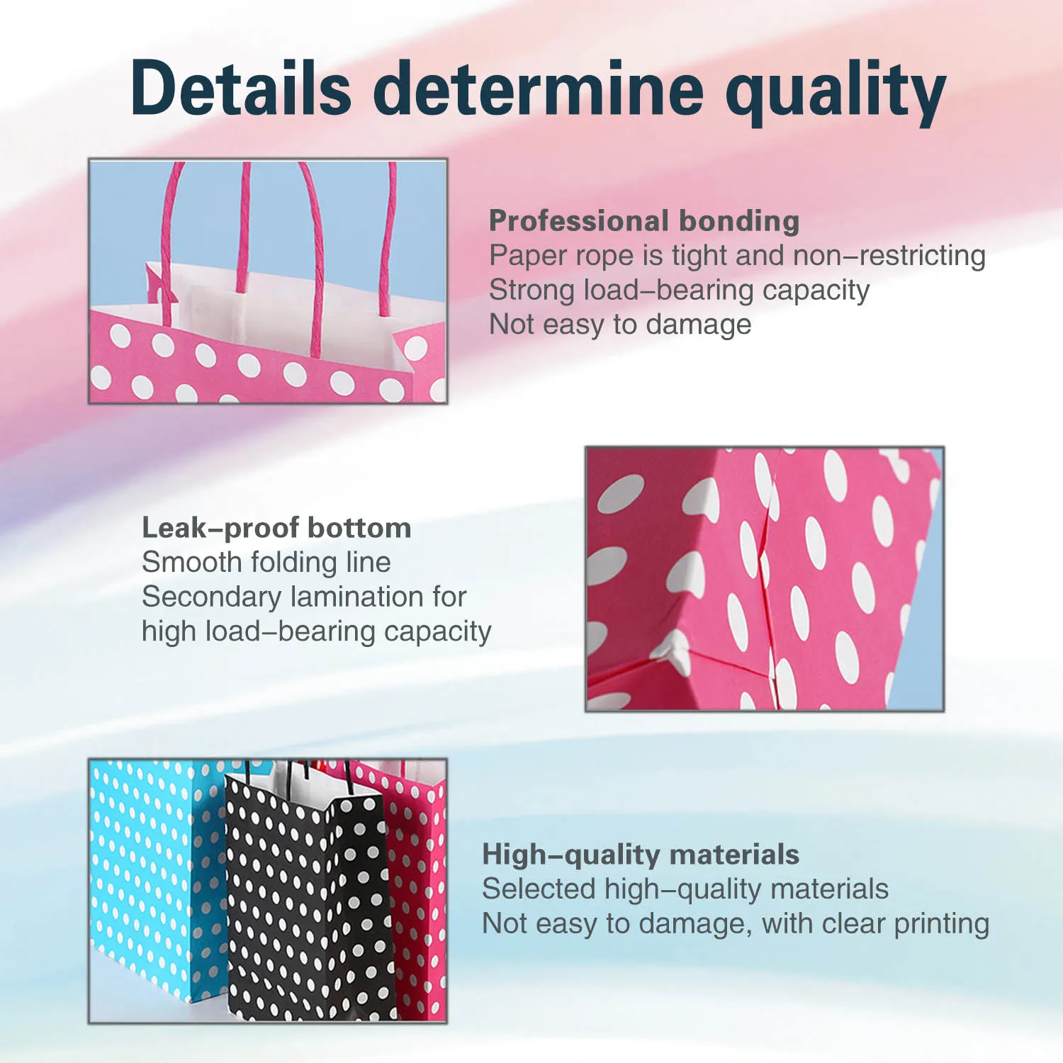 Sacs d'emballage cadeau à la mode : Conçus avec un motif à pois de quatre couleurs, il y a 4 pièces dans chaque couleur, totalisant 16.