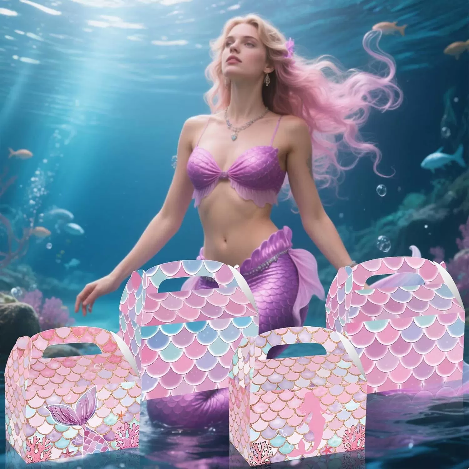 CARACTÉRISTIQUES DE CONCEPTION : 12 coffrets cadeaux à la mode sur le thème des sirènes avec des écailles de poisson et des motifs de queue imprimés dessus, inspirés des couleurs roses vibrantes.