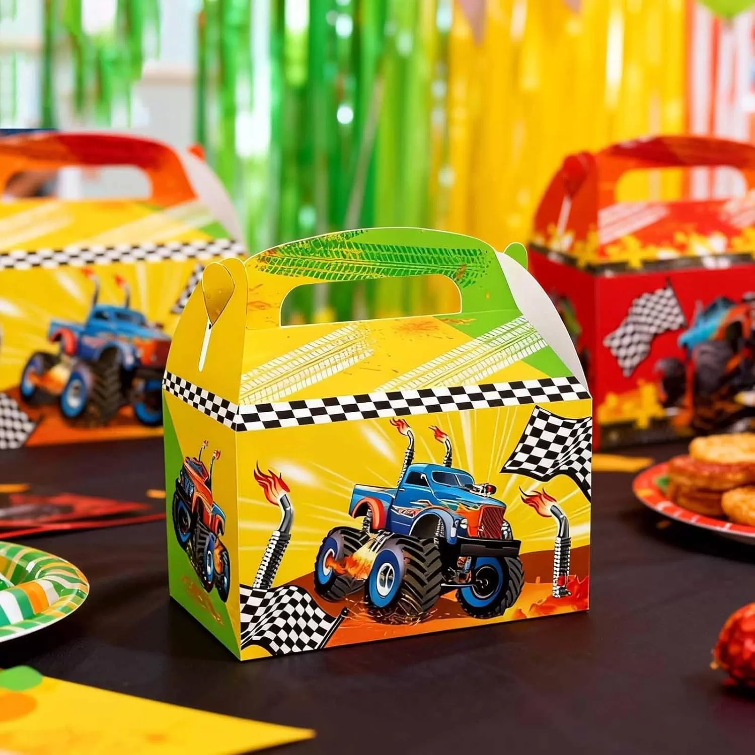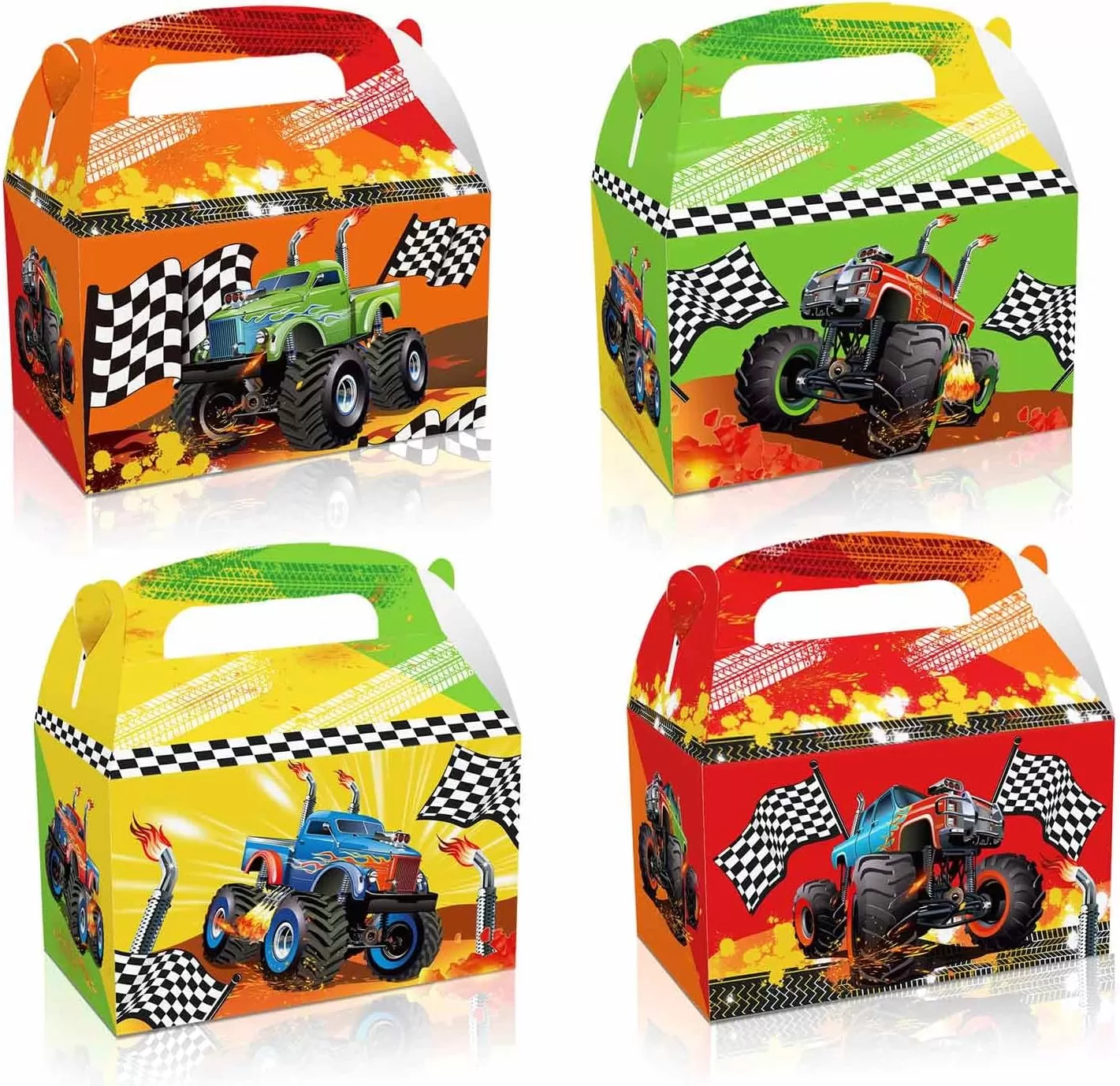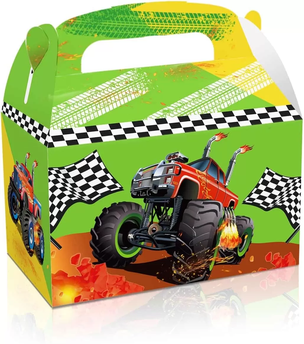 Boîte en papier sur le thème de Monster Truck : Ces sacs en papier cadeaux présentent des designs de camions colorés qui rehaussent l'atmosphère de l'événement et captent l'attention de tous.